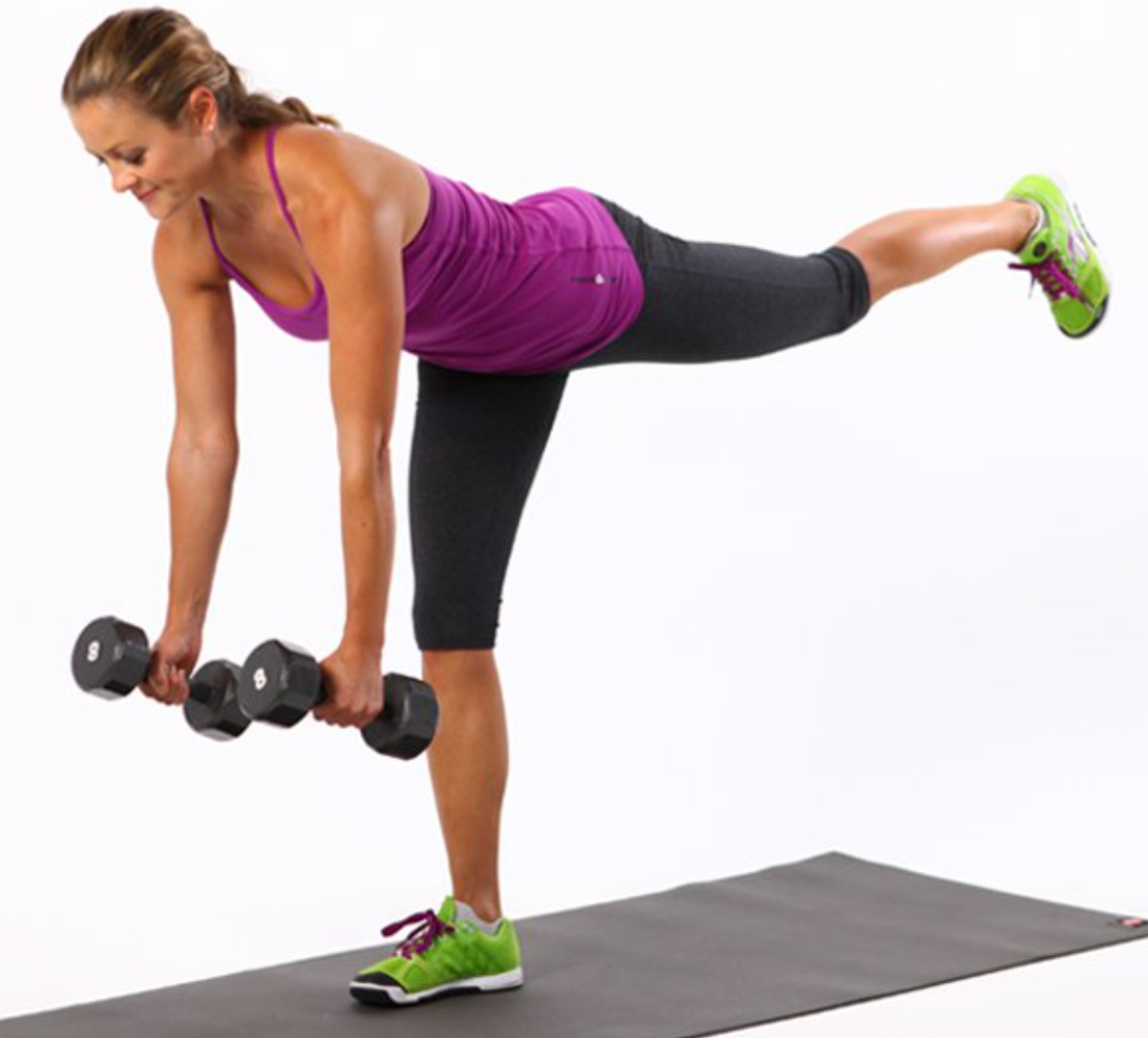 If you haven’t done these before, start without weights and hold a chair back for balance. Standing on one leg, bend forward at your hip and lift the opposite leg in the air. You should feel like a “dipping bird” without letting your back round at the bottom of the movement. Come back up and repeat. 3 sets of 10 on each leg.